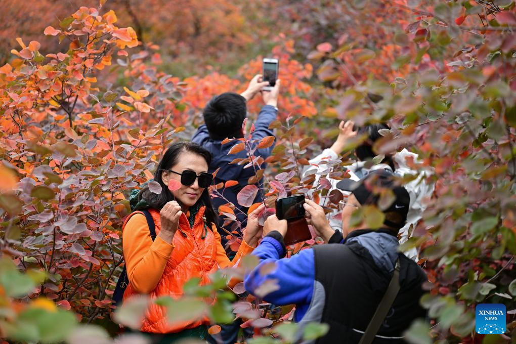 People pose for photos at Pofengling Scenic Area in Fangshan District of Beijing, Oct. 20, 2024. (Xinhua/Li Xin)