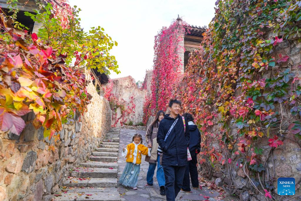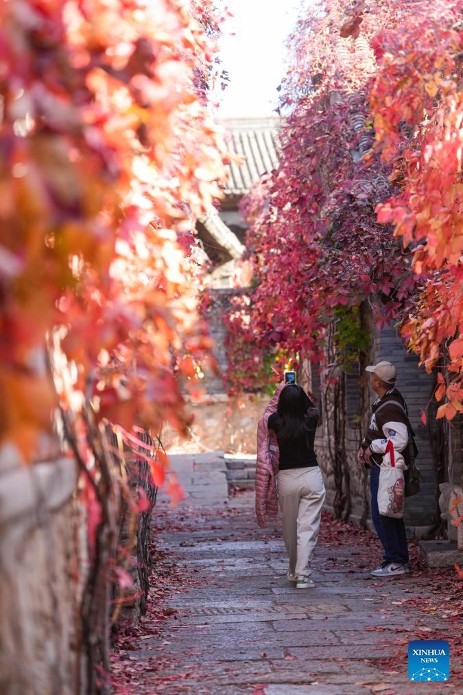 People enjoy the autumn scenery in the Gubei Water Town in Beijing, capital of China, Oct. 19, 2024. (Xinhua/Chen Yehua)