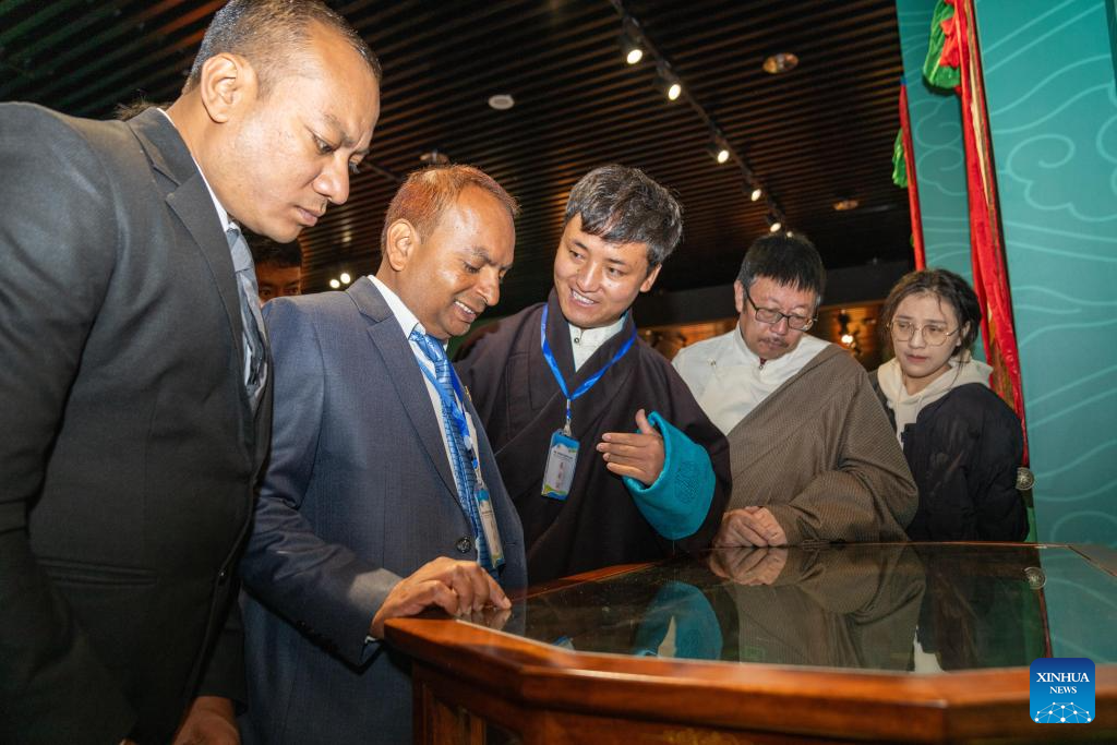 Guests attending the first International Academic Conference of the "Four Treatises of Tibetan Medicine" visit an exhibition featuring the "Four Treatises of Tibetan Medicine" in Lhasa, southwest China's Xizang Autonomous Region, Oct. 18, 2024. The first International Academic Conference of the "Four Treatises of Tibetan Medicine" kicked off here on Friday, with over 200 guests from both home and overseas attending. Written between the eighth and 12th centuries, the "Four Treatises of Tibetan Medicine" is the most influential foundational work in Tibetan medicine. (Xinhua/Tenzing Nima Qadhup)