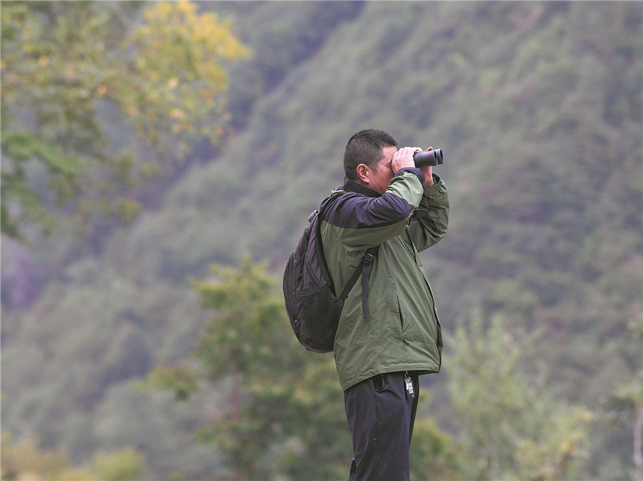 Tang Yulin monitors the forests with binoculars. (WANG XI/XINHUA)