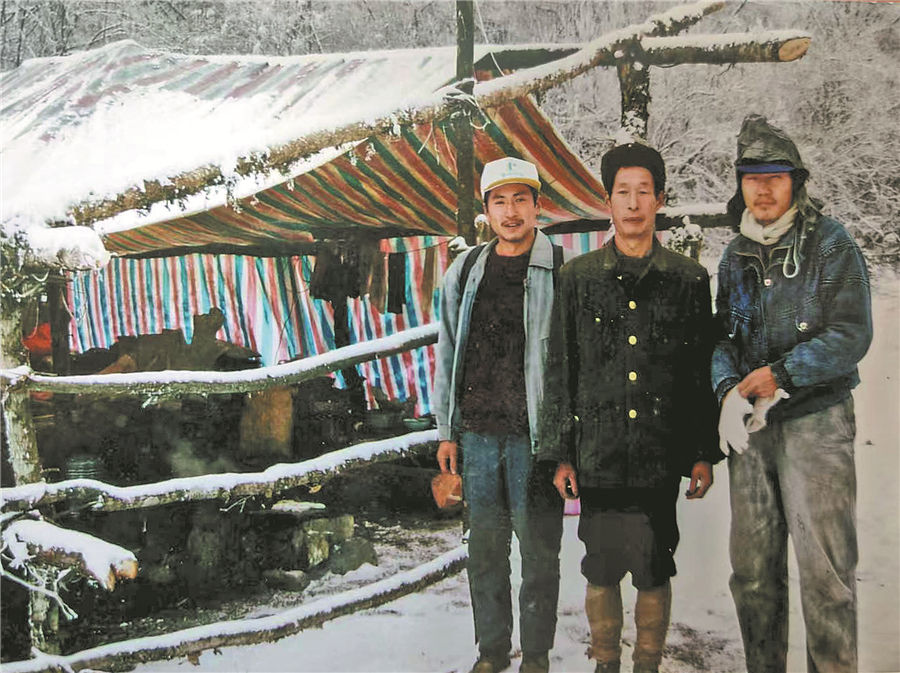 Taken in 1996, the file photo shows Tang Yulin (left) and his father Tang Daigui (middle), both forest rangers, with scientific researcher Gu Haijun in the reserve. (WANG XI/XINHUA)