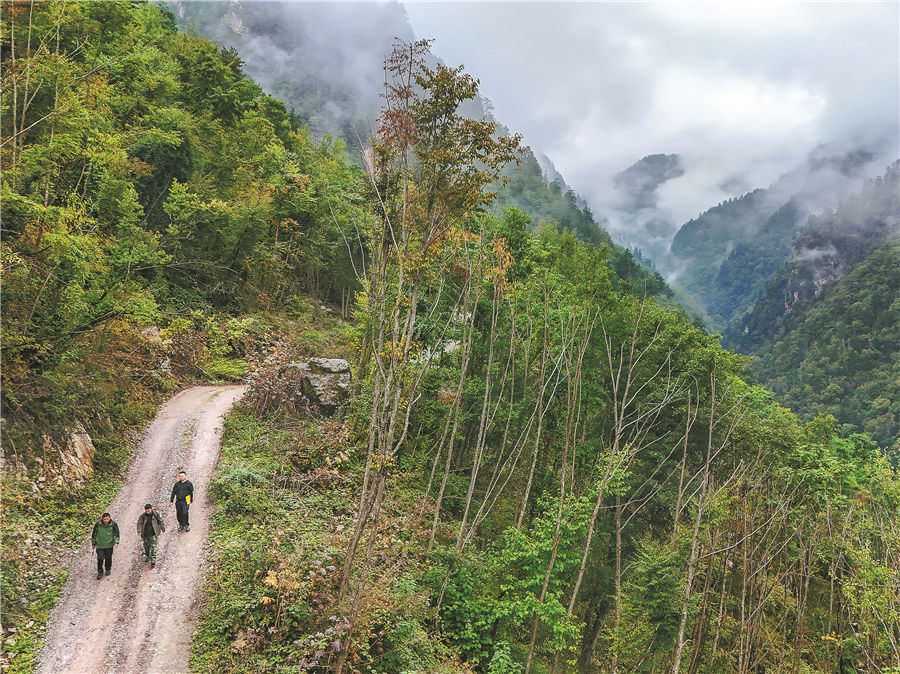With mist encroaching, Tang Yulin (left), Tang Xiaogang, and Liu (right) set out on patrol in the Baihe National Nature Reserve. (WANG XI/XINHUA)
