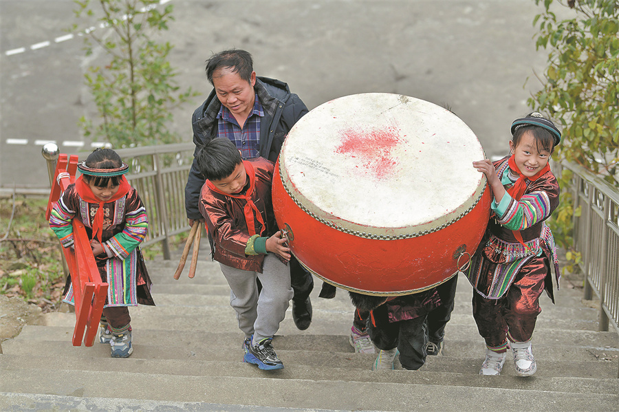 Meng helped several of his students move a drum to the square for the rehearsal of the drum dance on Feb 16 last year. (YANG WENBIN/XINHUA)