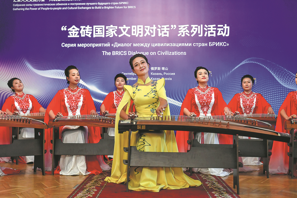 Chinese musicians play traditional tunes of the BRICS members with guzheng, a folk Chinese stringed instrument, during the BRICS Dialogue on Civilizations event in Kazan, Russia, on Sept 24. (CAO YANG/XINHUA)