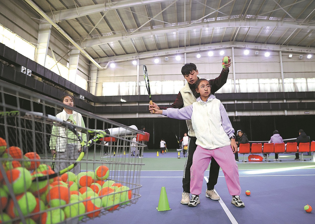 A girl receives tennis coaching during a winter camp in Yinchuan, Ningxia Hui autonomous region, on Jan 8. (YU JING/CHINA NEWS SERVICE)
