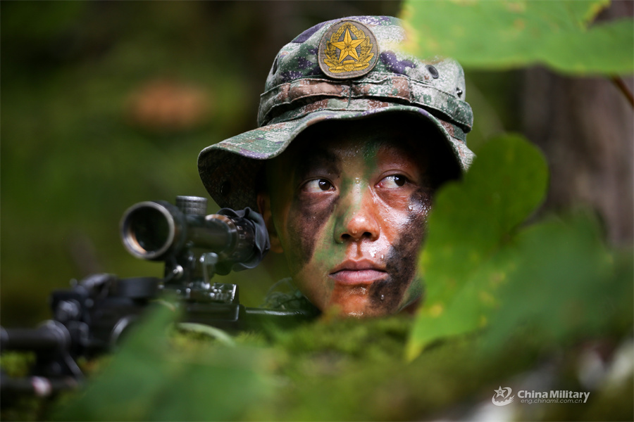 A soldier assigned to a regiment under the Chinese PLA Xizang Military Command observes surrounding environment during a tactical training exercise in the woods on August 27, 2024. (eng.chinamil.com.cn/Photo by Fu Shaoyin)