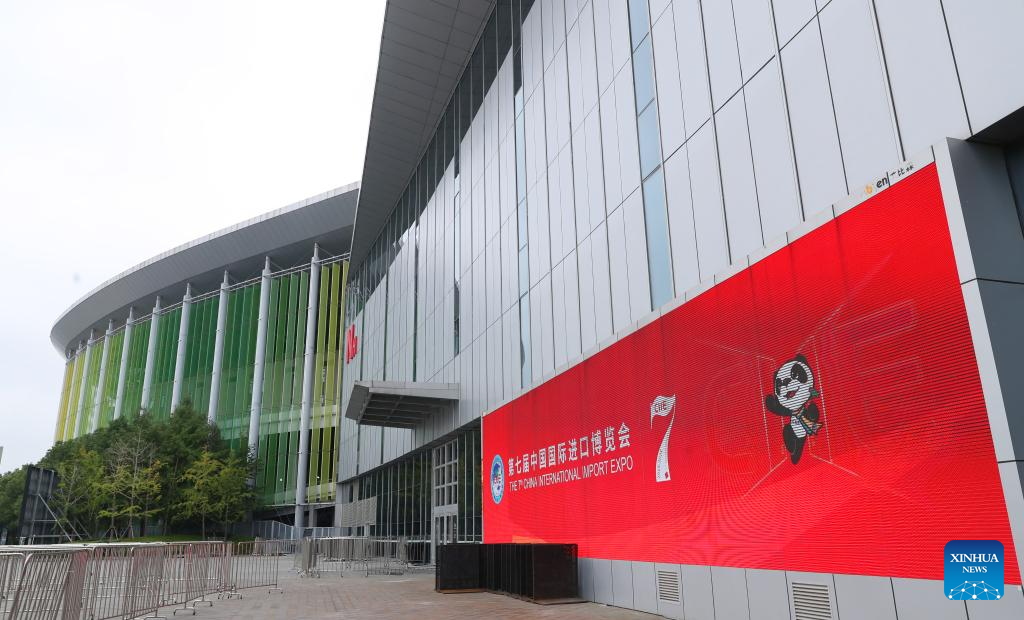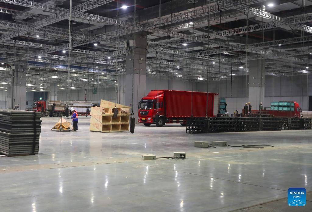 Workers get the venue ready for the upcoming 7th China International Import Expo (CIIE) at National Exhibition and Convention Center (Shanghai), east China's Shanghai, Oct. 22, 2024.