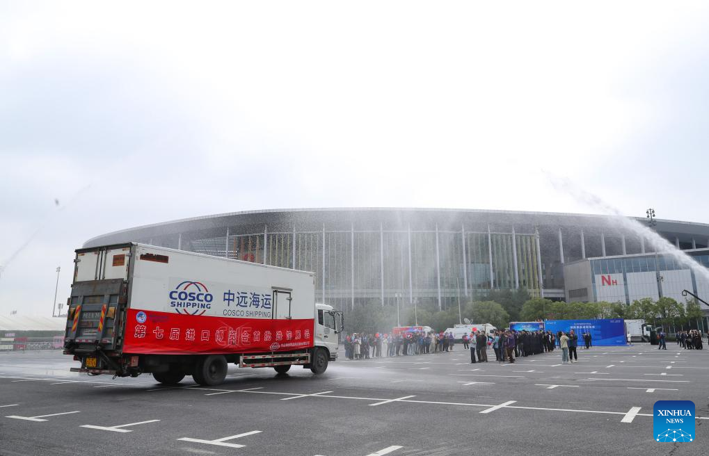 A truck loaded with exhibits for the upcoming 7th China International Import Expo (CIIE) is greeted with a water salute during an accession ceremony for exhibits at the National Exhibition and Convention Center (Shanghai), the main venue for the CIIE, in east China's Shanghai, Oct. 22, 2024.