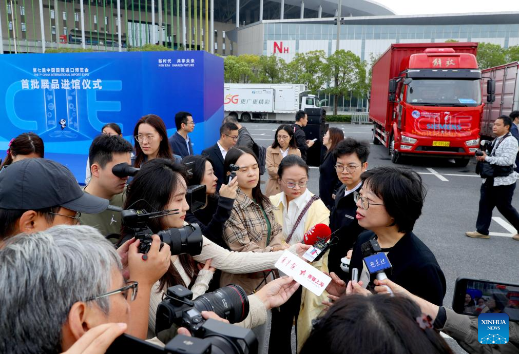 A representative of exhibitors for the upcoming 7th China International Import Expo (CIIE) accepts a media interview during an accession ceremony for exhibits at the National Exhibition and Convention Center (Shanghai), the main venue for the CIIE, in east China's Shanghai, Oct. 22, 2024.