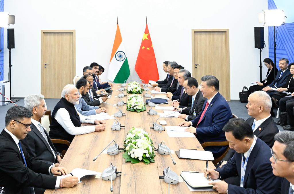 Chinese President Xi Jinping meets with Indian Prime Minister Narendra Modi on the sidelines of the 16th BRICS Summit in Kazan, Russia, Oct. 23, 2024. (Xinhua/Shen Hong)