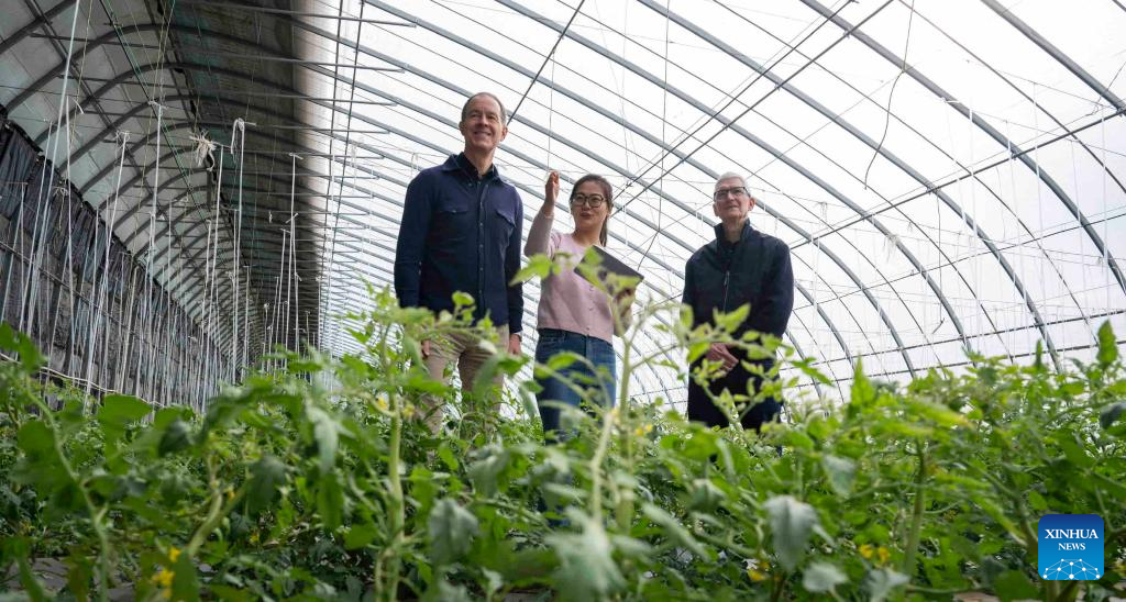 Shen Xinyi (C), a student at Zhejiang University, introduces a "science and technology backyard" to Apple CEO Tim Cook (L) and Jeff Williams, Apple's chief operating officer, at an organic farm in Shunyi District, Beijing, capital of China, Oct. 22, 2024. (Xinhua/Cai Yang)