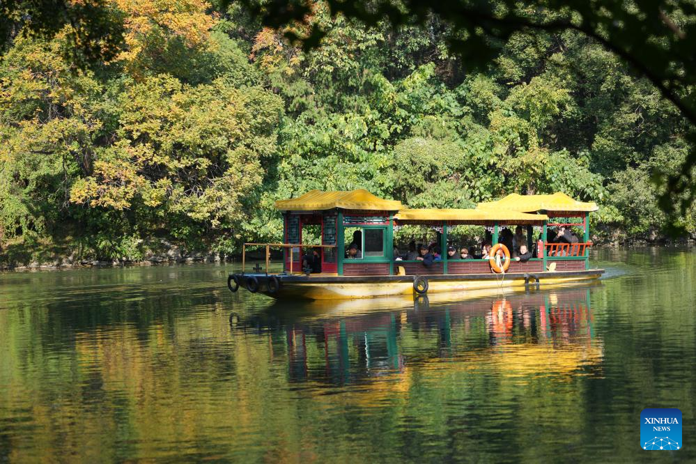 Tourists enjoy the autumn scenery on a sight-seeing boat at the Summer Palace in Beijing, capital of China, on Oct. 24, 2024. The Summer Palace is China's largest imperial park and among the most noted classical gardens in the world. In 1998, it was listed as one of the World Heritage Sites by UNESCO. (Xinhua/Xing Guangli)