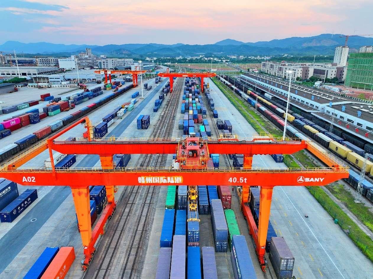 Containers are handled in a container yard of the Ganzhou international inland port in Ganzhou, east China's Jiangxi province, Sept. 4, 2024. (People's Daily Online/Zhu Haipeng)