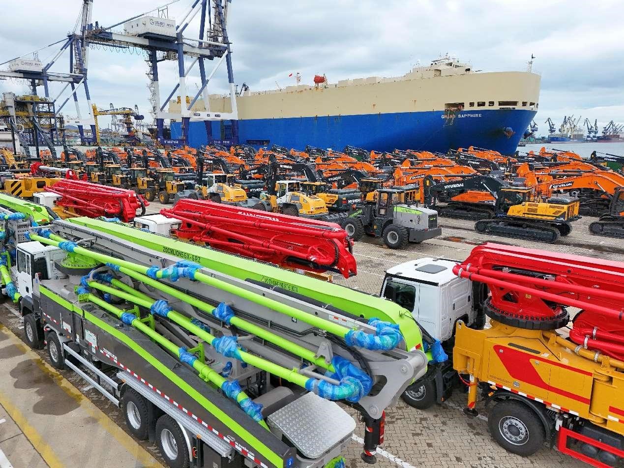 China-produced engineering machinery wait to be loaded and exported at the Yantai port in east China's Shandong province, Oct. 14, 2024. (People's Daily Online/Tang Ke)