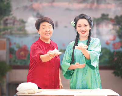 Photo shows young musician Liu Qingyao (R), clad in qipao, a traditional Chinese dress for women, and Qu Lirong, an inheritor of the intangible cultural heritage of Huabobo, a type of traditional steamed bun,? in Yantai city, east China's Shandong Province. (Photo courtesy of the interviewee)