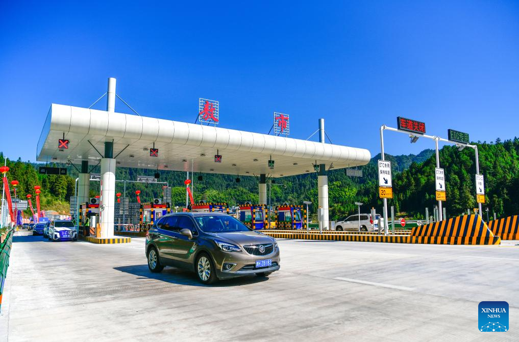 Vehicles pass a toll gate of the Jianhe-Liping expressway in Aoshi, southwest China's Guizhou Province, Oct. 25, 2024. The Jianhe-Liping expressway was opened to traffic on Friday, shortening the travel time between Jianhe County and Liping County of Guizhou Province to about one hour. The main line of this expressway stretches 74.754 kilometers. (Xinhua/Yang Wenbin)