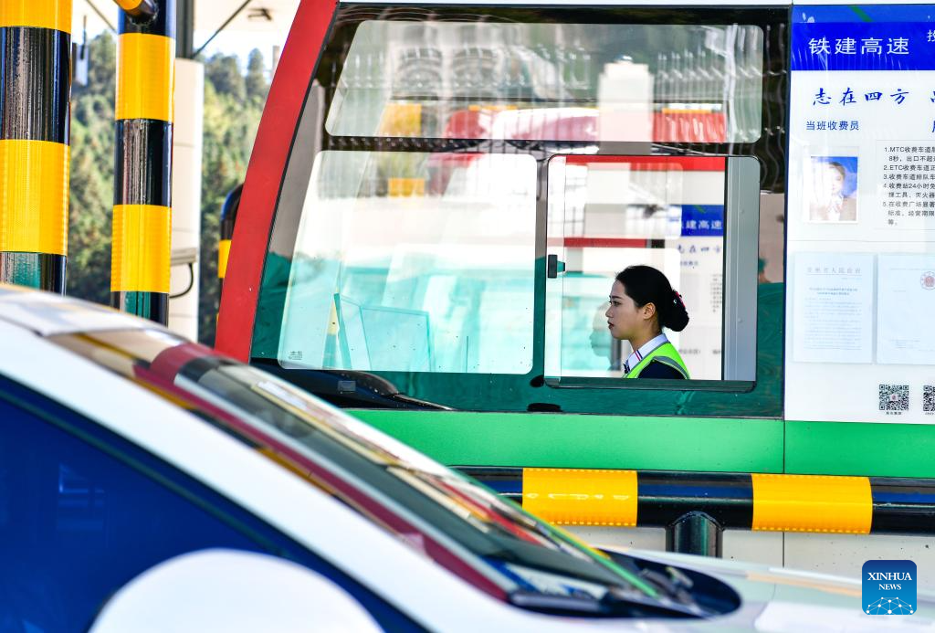 A staff member works at a toll gate of Jianhe-Liping highway in Aoshi, southwest China's Guizhou Province, Oct. 25, 2024. The Jianhe-Liping expressway was opened to traffic on Friday, shortening the travel time between Jianhe County and Liping County of Guizhou Province to about one hour. The main line of this expressway stretches 74.754 kilometers. (Xinhua/Yang Wenbin)