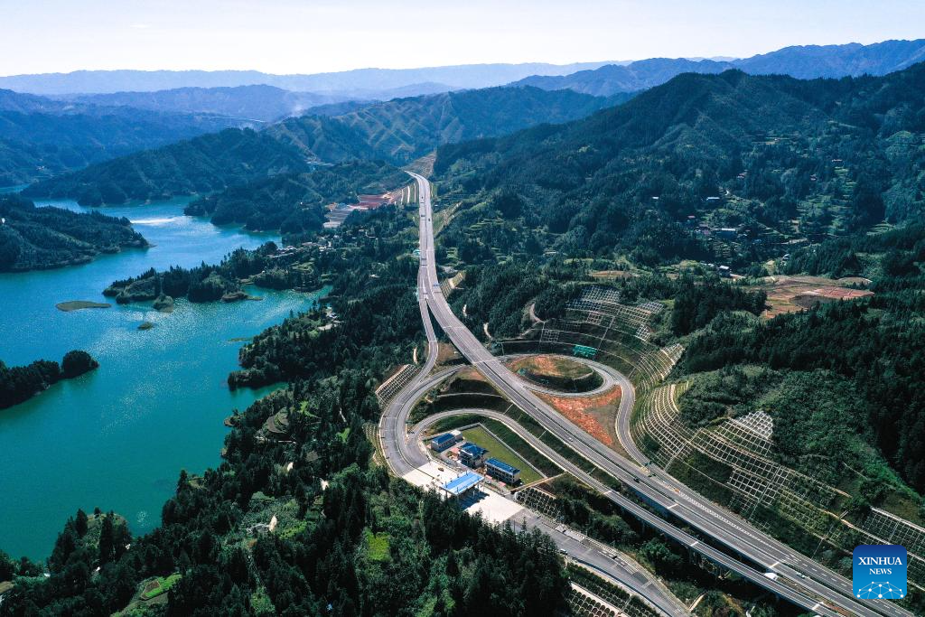 An aerial drone photo taken on Oct. 25, 2024 shows a section of the Jianhe-Liping expressway in southwest China's Guizhou Province. The Jianhe-Liping expressway was opened to traffic on Friday, shortening the travel time between Jianhe County and Liping County of Guizhou Province to about one hour. The main line of this expressway stretches 74.754 kilometers. (Xinhua/Yang Wenbin)