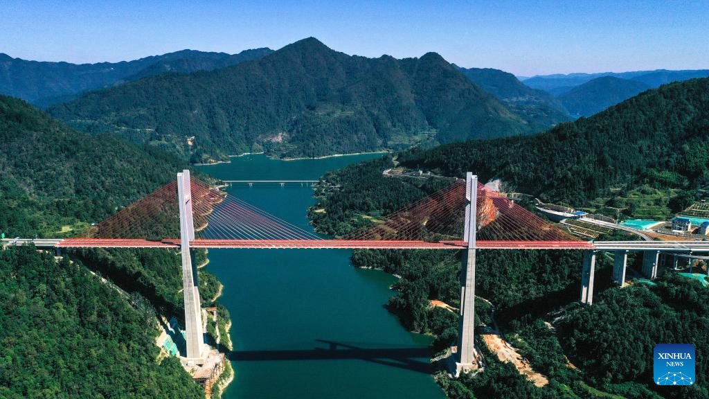 An aerial drone photo taken on Oct. 25, 2024 shows Nanmengxi bridge of the Jianhe-Liping expressway in southwest China's Guizhou Province. The Jianhe-Liping expressway was opened to traffic on Friday, shortening the travel time between Jianhe County and Liping County of Guizhou Province to about one hour. The main line of this expressway stretches 74.754 kilometers. (Xinhua/Yang Wenbin)