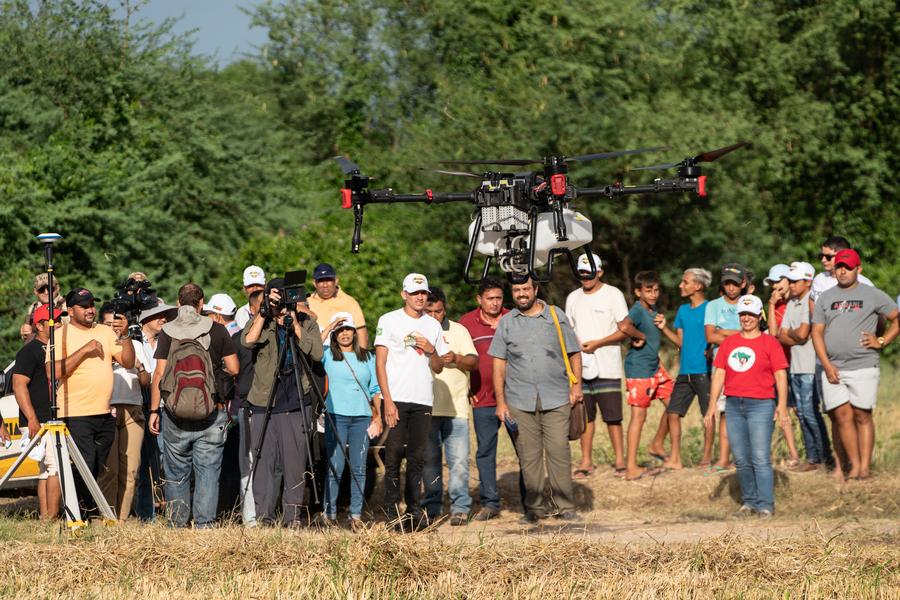 People watch the demonstration of an agricultural drone made in China during the launching ceremony of a China-Brazil agricultural mechanization cooperation demonstration project in Apodi, Brazil, Feb. 2, 2024. (Xinhua/Wang Tiancong)