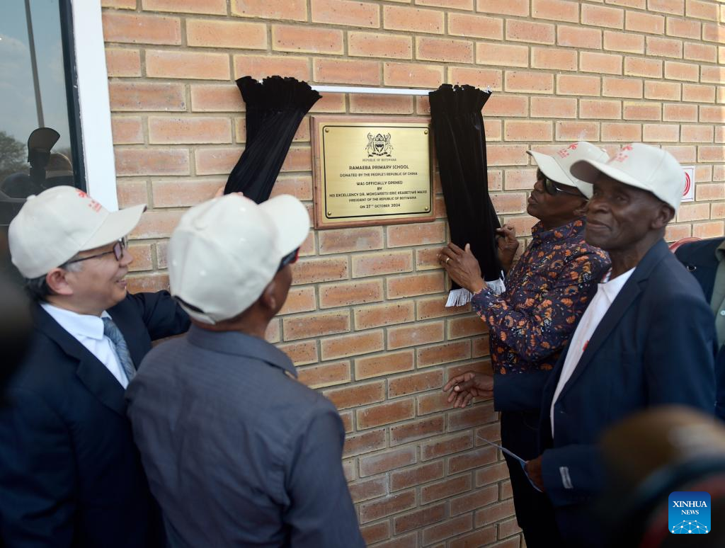 Botswanan President Mokgweetsi Masisi (2nd R) and China's ambassador to Botswana Fan Yong (1st L) unveil the plaque of the China-aided Ramaeba Primary School in Kazungula village of Kasane town, Botswana, Oct. 27, 2024. (Photo by Tshekiso Tebalo/Xinhua)