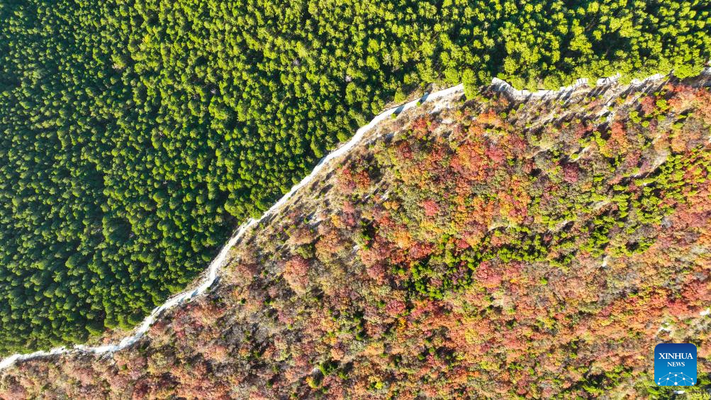 An aerial drone photo taken on Oct. 28, 2024 shows the autumn scenery of Xiezi Mountain in Jinan, east China's Shandong Province. (Photo by Hao Xincheng/Xinhua)
