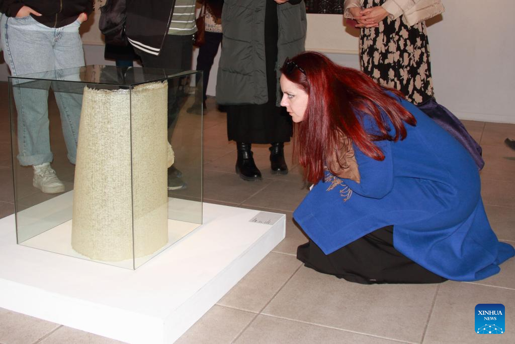 A visitor views an artwork at an exhibition of contemporary Chinese calligraphy and fiber art in Sofia, Bulgaria, on Oct. 28, 2024. An exhibition of contemporary Chinese calligraphy and fiber art opened on Monday evening at Bulgaria's National Academy of Art (NAA). Titled "Attitude in Black and White," the three-week exhibition is co-hosted by the NAA and the China Academy of Art (CAA), Hangzhou, showcasing the artworks of faculty members from the Calligraphy and Fiber Art Departments of the CAA. (Photo by Marian Draganov/Xinhua)