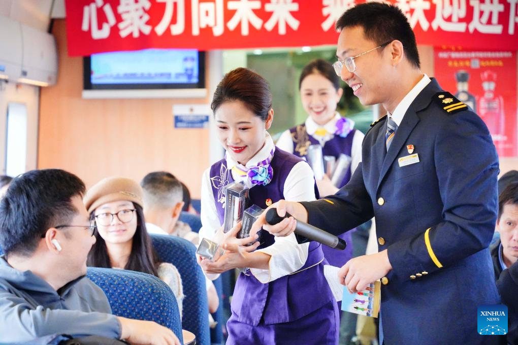 A train attendant introduces to passengers the seventh China International Import Expo (CIIE) during a promotion event for the CIIE on the train D3205 on Oct. 28, 2024. The CIIE is scheduled to take place in Shanghai from Nov. 5 to 10. (Photo by Xie Xin/Xinhua)