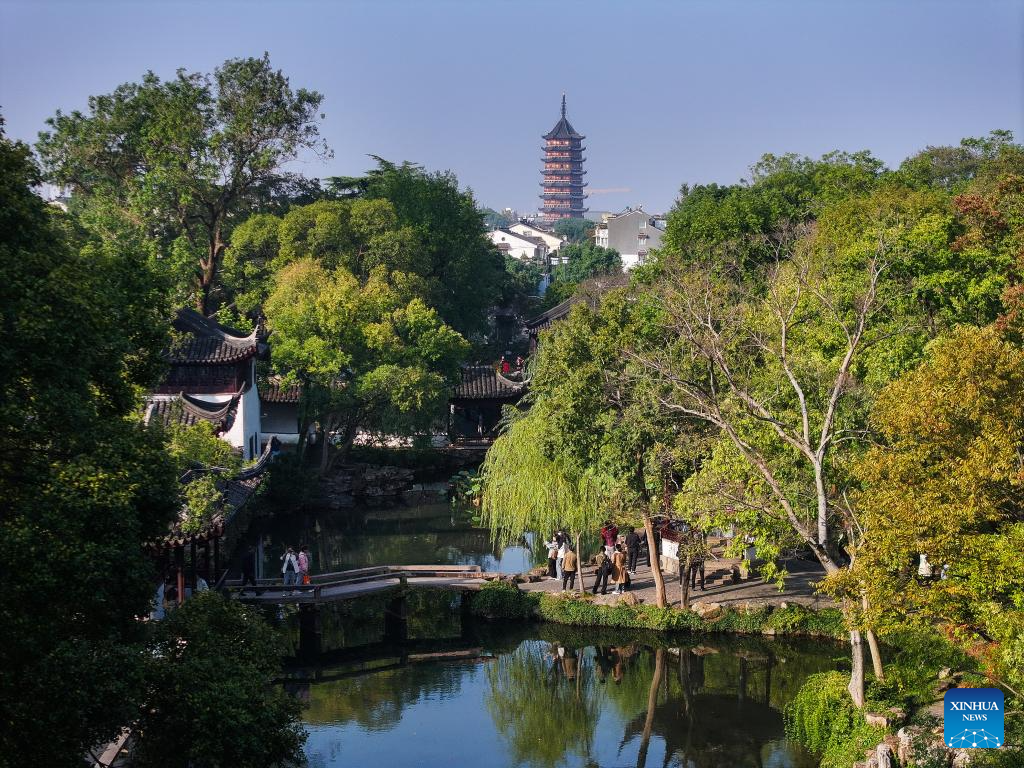 A drone photo taken on Oct. 23, 2024 shows the scenery at the Tiger Hill scenic area in Suzhou, east China's Jiangsu Province. About a 20-minute ride by high-speed train from east China's Shanghai, Suzhou is one of the richest cities in China, with its more than 100 classical gardens considered some of the most beautiful in the country, and nine of them serving as UNESCO world heritage sites.