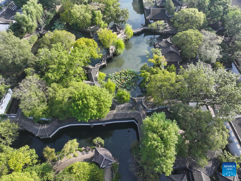 A drone photo taken on Oct. 23, 2024 shows people visiting Humble Administrator's Garden in Suzhou, east China's Jiangsu Province. About a 20-minute ride by high-speed train from east China's Shanghai, Suzhou is one of the richest cities in China, with its more than 100 classical gardens considered some of the most beautiful in the country, and nine of them serving as UNESCO world heritage sites.