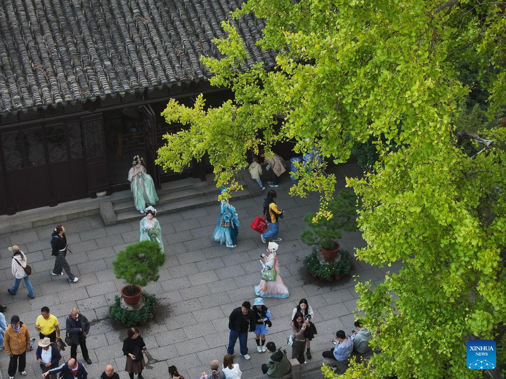 A drone photo taken on Oct. 23, 2024 shows a woman in traditional Chinese costume visiting the Lingering Garden in Suzhou, east China's Jiangsu Province. About a 20-minute ride by high-speed train from east China's Shanghai, Suzhou is one of the richest cities in China, with its more than 100 classical gardens considered some of the most beautiful in the country, and nine of them serving as UNESCO world heritage sites.