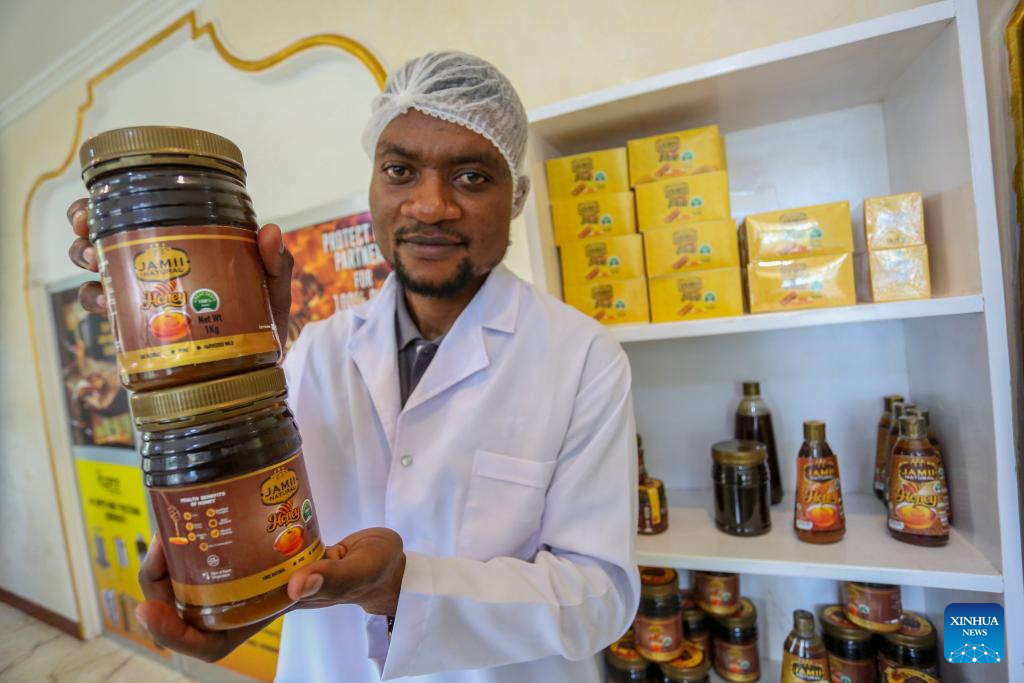 Jackson Mponela, production manager for commerce and development at Tanzania Future Enterprises Company Limited, shows honey products at a factory in Dar es Salaam, Tanzania, on Oct. 28, 2024. Four employees of a honey processing company located at Goba, 18 kilometers north of Tanzania's port city of Dar es Salaam, are busy making final preparations for participation in the seventh edition of the China International Import Expo (CIIE), which will be held in Shanghai from Nov. 5 through Nov. 10. (Photo by Emmanuel Herman/Xinhua)