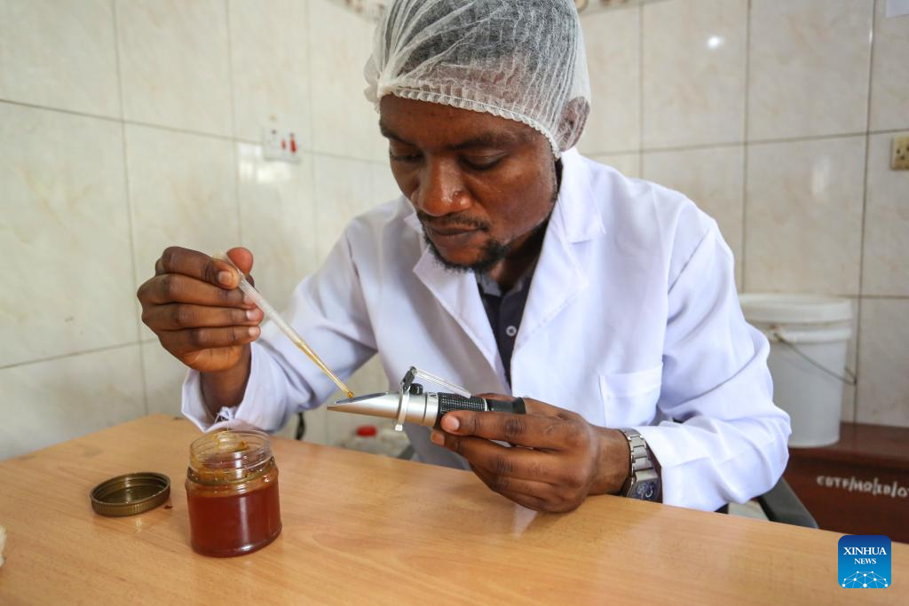 Jackson Mponela, production manager for commerce and development at Tanzania Future Enterprises Company Limited, inspects honey quality before packaging in bottles at a factory in Dar es Salaam, Tanzania, on Oct. 28, 2024. Four employees of a honey processing company located at Goba, 18 kilometers north of Tanzania's port city of Dar es Salaam, are busy making final preparations for participation in the seventh edition of the China International Import Expo (CIIE), which will be held in Shanghai from Nov. 5 through Nov. 10. (Photo by Emmanuel Herman/Xinhua)