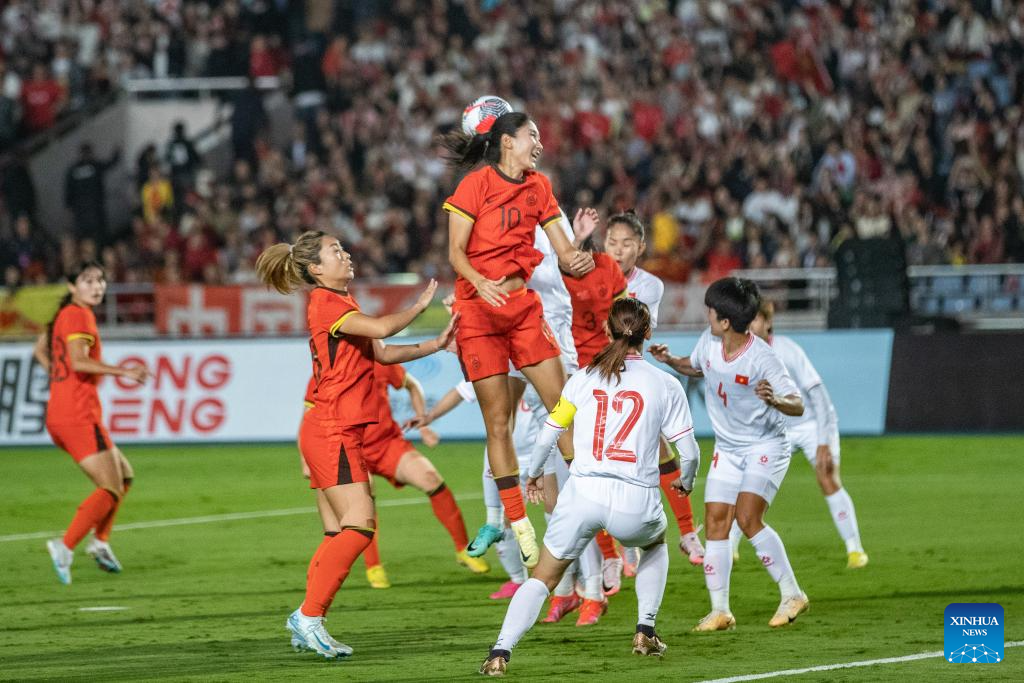 Wang Yanwen (top) of China heads the ball during the match between China and Vietnam at 2024 CFA Team China International Women's Football Tournament Yongchuan in Chongqing, southwest China, Oct. 29, 2024. (Xinhua/Huang Wei)