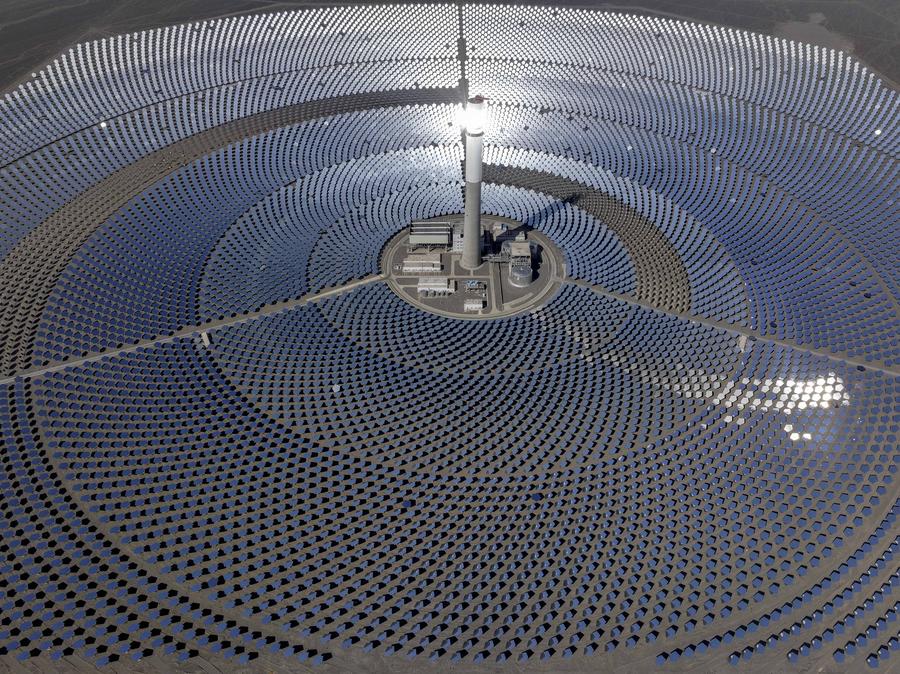An aerial drone photo taken on Sept. 12, 2024 shows a partial view of a 50-megawatt molten-salt solar thermal power plant in Naomaohu Township of Hami City, northwest China's Xinjiang Uygur Autonomous Region. (Xinhua/Hu Huhu)