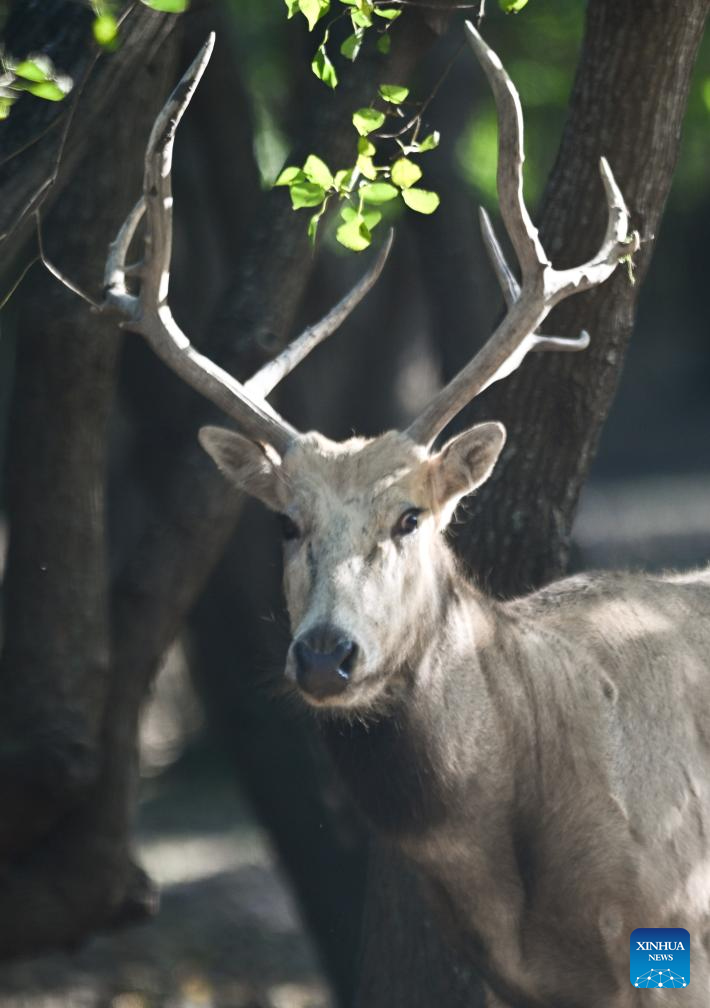 A milu deer is seen in Dafeng Milu National Nature Reserve in east China's Jiangsu Province, Oct. 28, 2024. Thanks to reinforced efforts in ecological protection and animal preservation, the Dafeng Milu National Nature Reserve has welcomed 825 newborns of milu deer, a species endemic to China, so far this year. The milu deer population here has exceeded 8,200, including some 3,500 living on their own in the wild. (Xinhua/Li Bo)