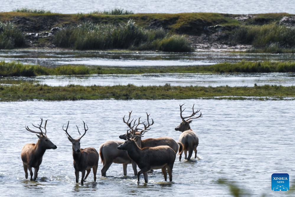 Milu deer are seen in Dafeng Milu National Nature Reserve in east China's Jiangsu Province, Oct. 28, 2024. Thanks to reinforced efforts in ecological protection and animal preservation, the Dafeng Milu National Nature Reserve has welcomed 825 newborns of milu deer, a species endemic to China, so far this year. The milu deer population here has exceeded 8,200, including some 3,500 living on their own in the wild. (Xinhua/Deng Hua)