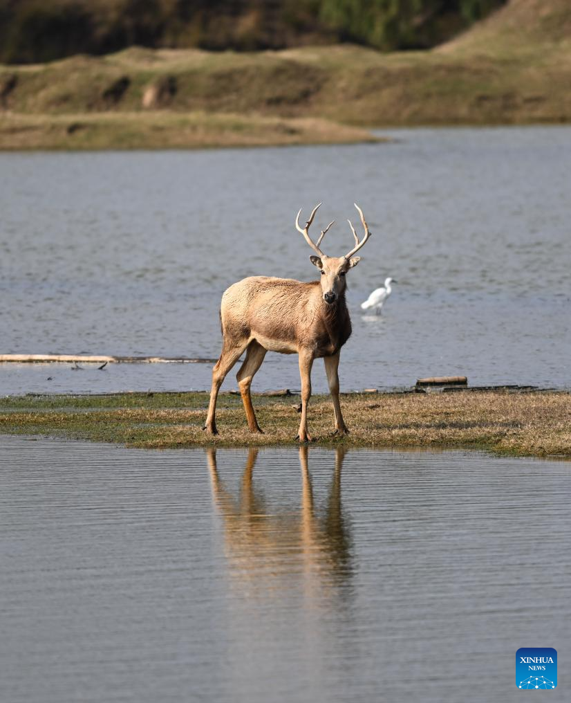 A milu deer is seen in Dafeng Milu National Nature Reserve in east China's Jiangsu Province, Oct. 28, 2024. Thanks to reinforced efforts in ecological protection and animal preservation, the Dafeng Milu National Nature Reserve has welcomed 825 newborns of milu deer, a species endemic to China, so far this year. The milu deer population here has exceeded 8,200, including some 3,500 living on their own in the wild. (Xinhua/Deng Hua)