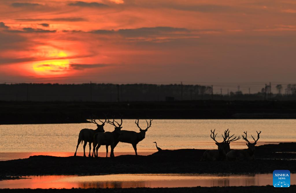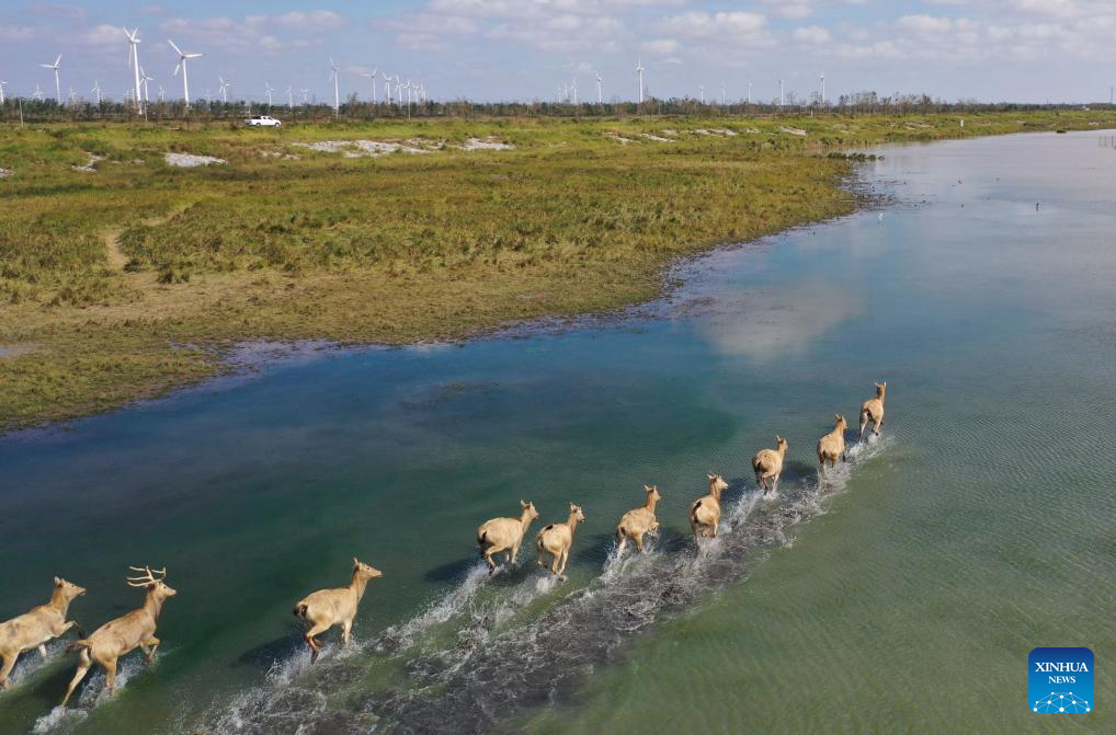 Milu deer are seen in Dafeng Milu National Nature Reserve in east China's Jiangsu Province, Oct. 28, 2024. Thanks to reinforced efforts in ecological protection and animal preservation, the Dafeng Milu National Nature Reserve has welcomed 825 newborns of milu deer, a species endemic to China, so far this year. The milu deer population here has exceeded 8,200, including some 3,500 living on their own in the wild. (Xinhua/Lyu Shuai)