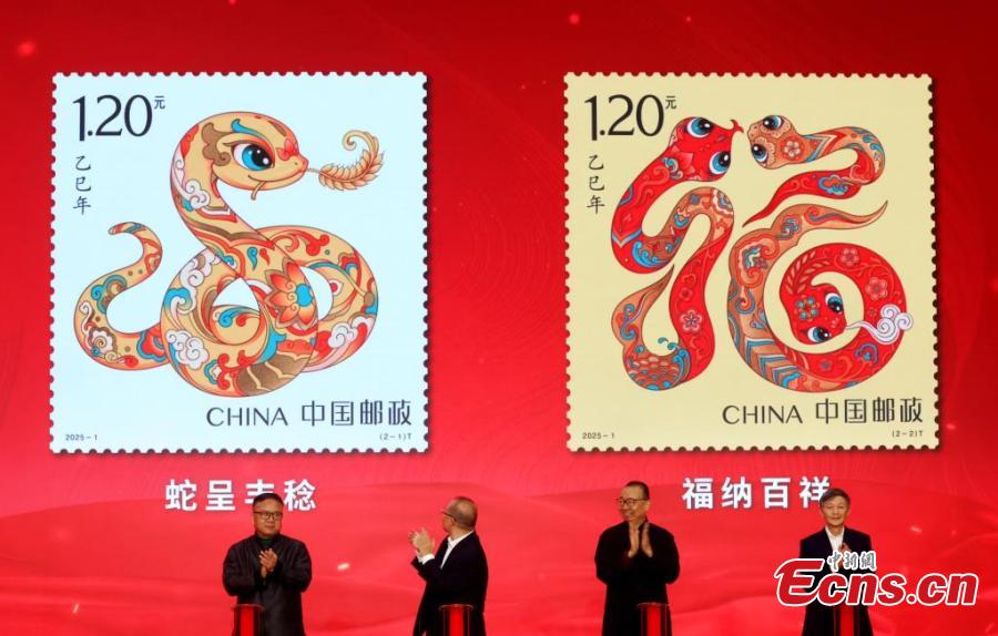 China Post unveils the designs of special stamps to celebrate the upcoming Chinese zodiac Year of the Snake in Beijing, Oct. 30, 2024. (Photo: China News Service/Zhang Yu)