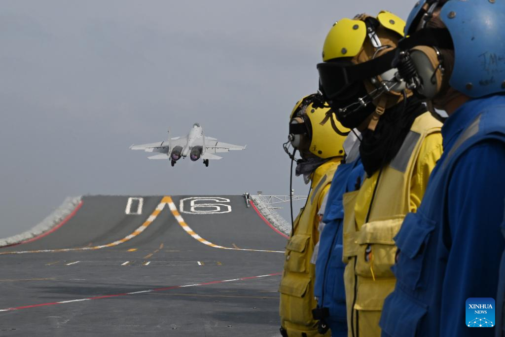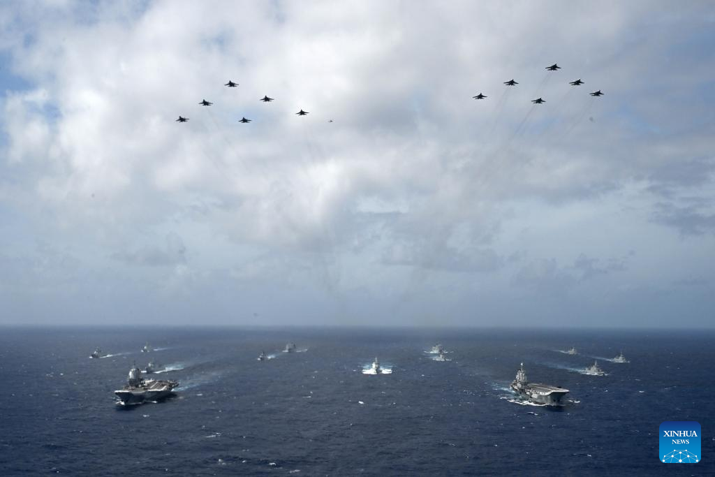 The formation of Chinese aircraft carrier Liaoning carry out a regular real-combat training in the high seas in late October 2024. The formations of Chinese aircraft carriers Liaoning and Shandong carried out a dual aircraft carrier formation exercise for the first time in the South China Sea, as part of the Liaoning aircraft carrier formation's regular real-combat training in the high seas, which concluded recently. (Photo by Pu Haiyang/Xinhua)