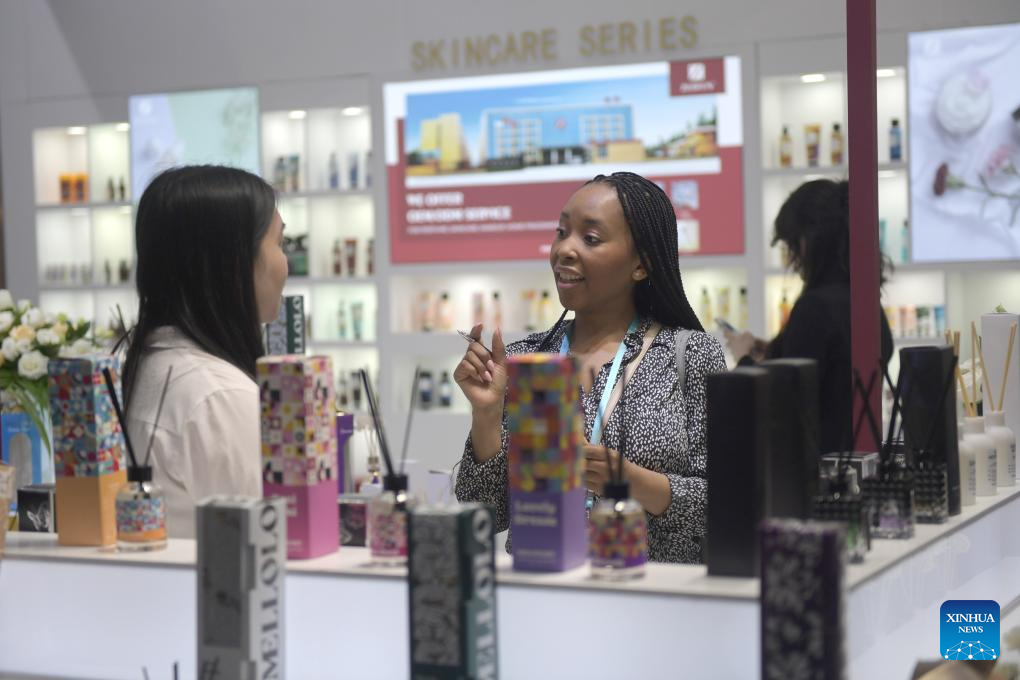 A merchant selects aromatherapy products at the 136th China Import and Export Fair in Guangzhou, south China's Guangdong Province, Oct. 31, 2024. The third phase of the 136th China Import and Export Fair, popularly known as the Canton Fair, opened in Guangzhou on Thursday. (Xinhua/Lu Hanxin)