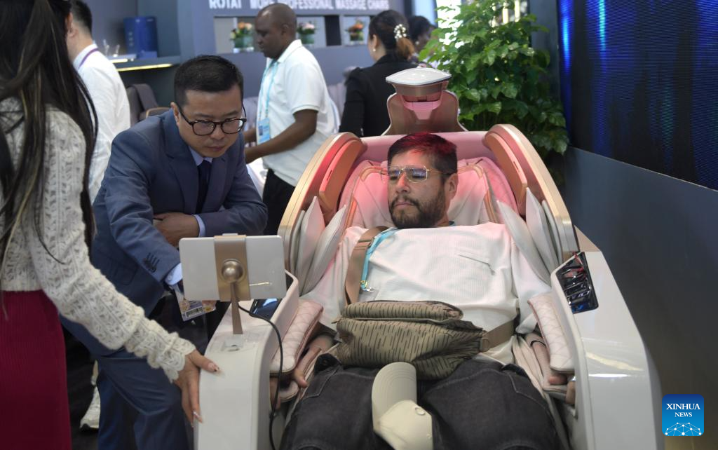 A merchant tries a massage chair at the 136th China Import and Export Fair in Guangzhou, south China's Guangdong Province, Oct. 31, 2024. The third phase of the 136th China Import and Export Fair, popularly known as the Canton Fair, opened in Guangzhou on Thursday. (Xinhua/Lu Hanxin)