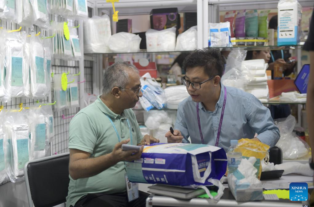 A merchant selects sanitary products at the 136th China Import and Export Fair in Guangzhou, south China's Guangdong Province, Oct. 31, 2024. The third phase of the 136th China Import and Export Fair, popularly known as the Canton Fair, opened in Guangzhou on Thursday. (Xinhua/Lu Hanxin)