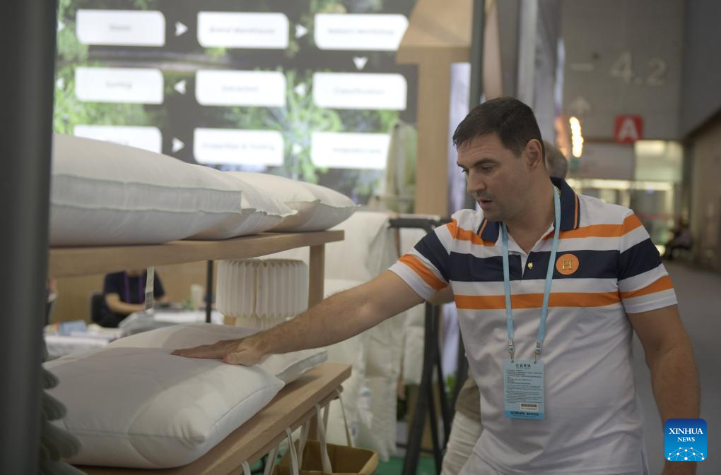 A merchant shops for bedding products at the 136th China Import and Export Fair in Guangzhou, south China's Guangdong Province, Oct. 31, 2024. The third phase of the 136th China Import and Export Fair, popularly known as the Canton Fair, opened in Guangzhou on Thursday. (Xinhua/Lu Hanxin)