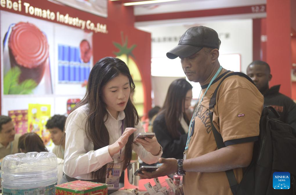 A merchant interacts with an exhibitor at the 136th China Import and Export Fair in Guangzhou, south China's Guangdong Province, Oct. 31, 2024. The third phase of the 136th China Import and Export Fair, popularly known as the Canton Fair, opened in Guangzhou on Thursday. (Xinhua/Lu Hanxin)