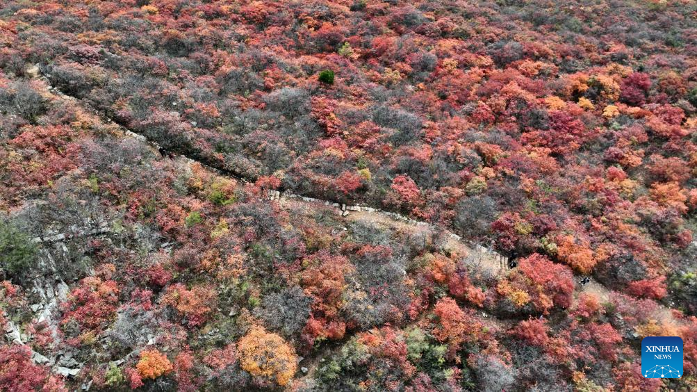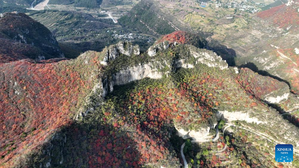 This aerial drone photo taken on Oct. 30, 2024 shows the autumn scenery of Jiguan Mountain scenic area in Shahe City, north China's Hebei Province. The Jiguan Mountain has entered its peak viewing season, drawing tourists to explore its beauty. (Xinhua/Mu Yu)