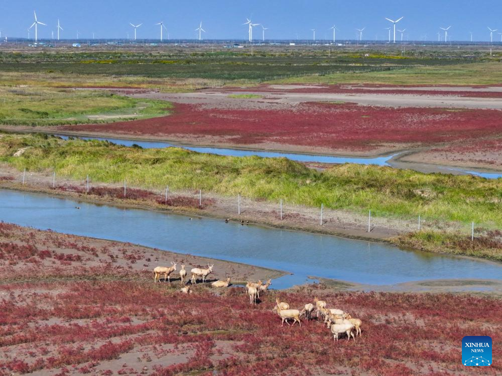 An aerial drone photo taken on Oct. 29, 2024 shows elks at Tiaozini wetland in Dongtai of Yancheng City, east China's Jiangsu Province. (Xinhua/Deng Hua)