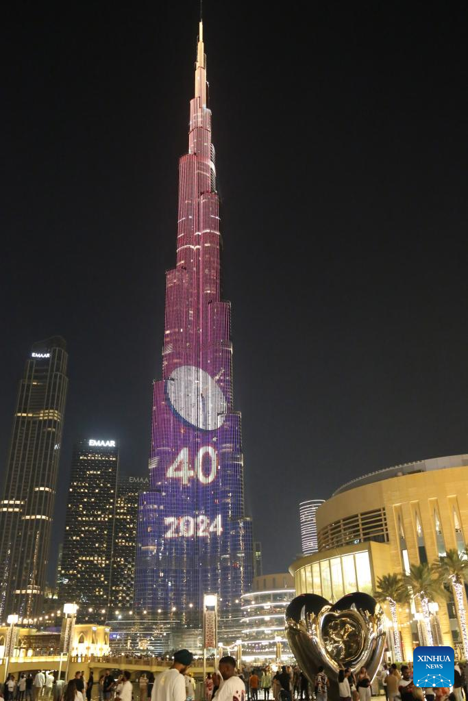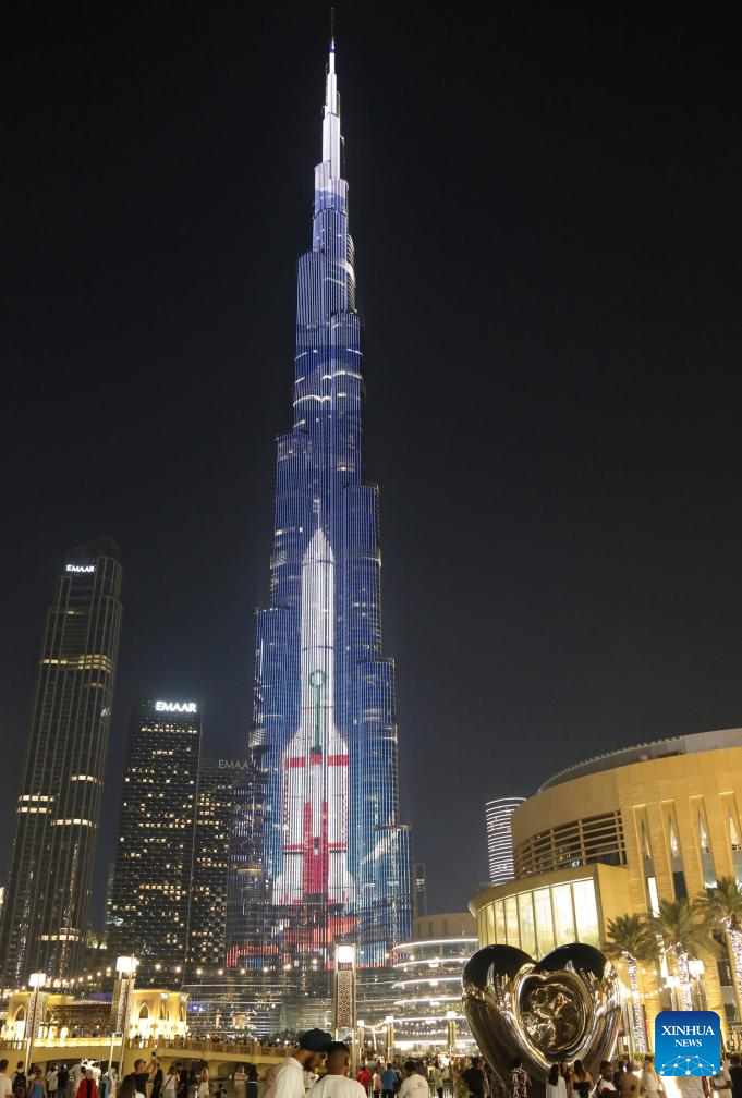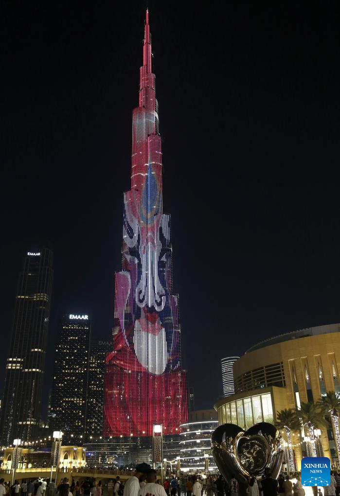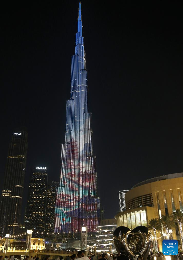 This photo taken on Nov. 1, 2024 shows a light show presented on the skyscraper Burj Khalifa to celebrate the 40th anniversary of diplomatic relations between China and the United Arab Emirates (UAE), in Dubai, the United Arab Emirates. (Xinhua/Wen Xinnian)