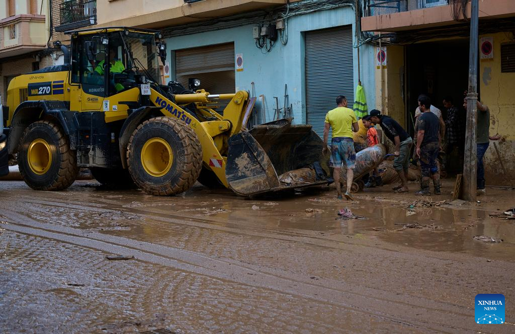 People clean up a flood-hit street in Valencia, Spain, Nov. 1, 2024. Spain remains deeply shaken by the deadly flash floods that have left 205 people confirmed dead and wrecked havoc across the regions of Valencia, Castilla-La Mancha and Andalusia in the east and southeast parts of the country. As of Friday, many more are still unaccounted for. (Photo by Pablo Morano/Xinhua)